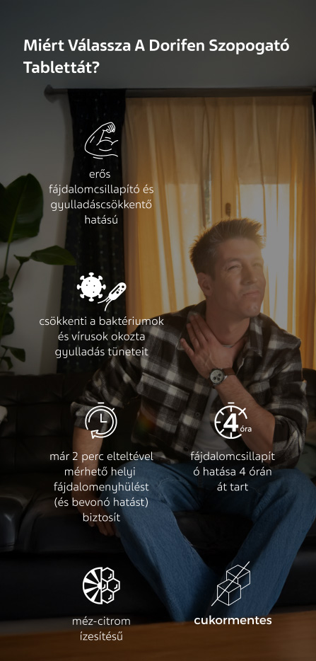 KÍNZÓ TOROKGYULLADÁS? ENYHÍTSE TÜNETEIT DORIFEN SZOPOGATÓ TABLETTÁVAL.